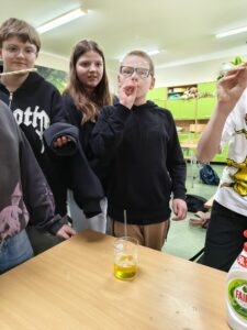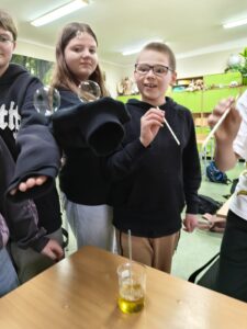 Na ostatnich zajęciach koła biologicznego zamieniliśmy salę w małe laboratorium pełne kolorów, piany i… ekologicznych wynalazków. Uczniowie sprawdzali, jak działa świat, którego na co dzień nie widać – od błon komórkowych po naturalne tworzywa.