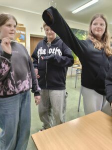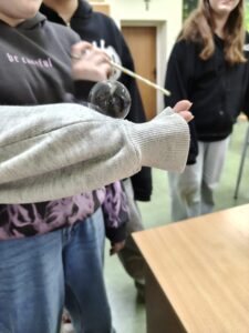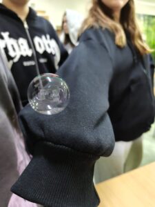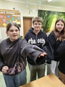Zwykłe bańki? Nie tym razem! Uczniowie przygotowali specjalny roztwór, dzięki któremu bańki były wyjątkowo trwałe. Posłużyły nam jako model błony komórkowej – cienkiej, elastycznej warstwy, która chroni każdą komórkę. Dzięki doświadczeniu można było zobaczyć, jak zachowuje się taka „biologiczna skórka”, dlaczego jest elastyczna i co sprawia, że czasem pęka.