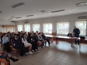Podczas prelekcji omówiono problem cyberprzemocy i hejtu w internecie, ze szczególnym uwzględnieniem konsekwencji prawnych oraz wpływu takich zachowań na innych. Policjant poruszył również temat uchylania się od obowiązku szkolnego, czyli wagary, podkreślając znaczenie regularnego uczęszczania do szkoły oraz odpowiedzialności ucznia za własne decyzje. Ważnym elementem spotkania było także przedstawienie zasad zachowania się małoletnich podczas kontroli policyjnej, a także omówienie praw i obowiązków przysługujących nieletnim.