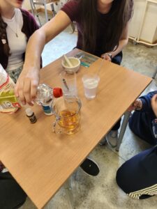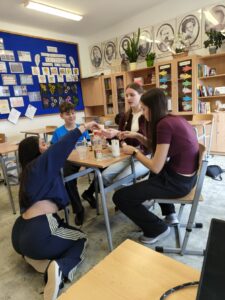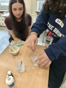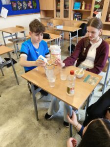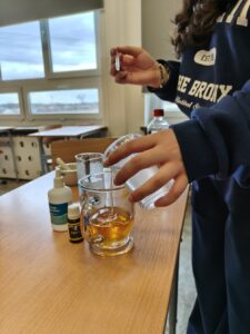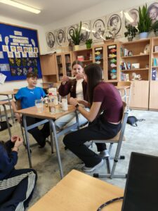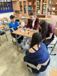 W trakcie oczekiwania na efekty reakcji nie zabrakło również elementów humorystycznych – uczniowie żartobliwie stwierdzili, że odkryli „nowy przepis na slima”, co wywołało wiele śmiechu i jeszcze bardziej uprzyjemniło wspólnie spędzony czas. Zajęcia nie tylko poszerzyły ich wiedzę chemiczną, ale także pokazały, że nauka może być fascynująca i pełna dobrej zabawy.