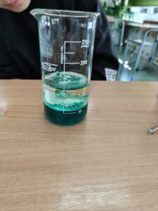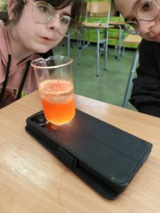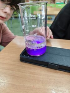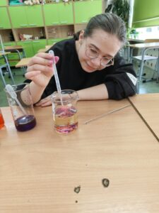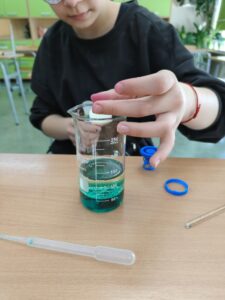 Podczas zajęć rozwijających kreatywność uczniowie klasy V mieli okazję wcielić się w młodych odkrywców i przeprowadzić efektowne doświadczenie „Lampa lawa”. Eksperyment wzbudził duże zainteresowanie i dostarczył wielu emocji, ponieważ uczniowie mogli obserwować niezwykłe zjawisko unoszących się i opadających kolorowych bąbelków, przypominających prawdziwą lampę lawową.